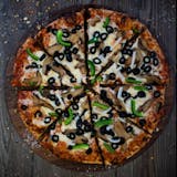 Mushrooms, crisp green peppers, fresh black olives, onions and banana peppers with pizza cheese blend on our traditional pizza sauce.