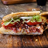 Mushrooms, green peppers, black olives, banana peppers and onions covered with melted cheese, lettuce, tomato, and Italian dressing.